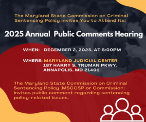 The MSCCSP invites comment regarding criminal sentencing policy-related issues at its annual public comments hearing to be held at 5:00 pm on December 2, 2025 at the Maryland Judicial Center.