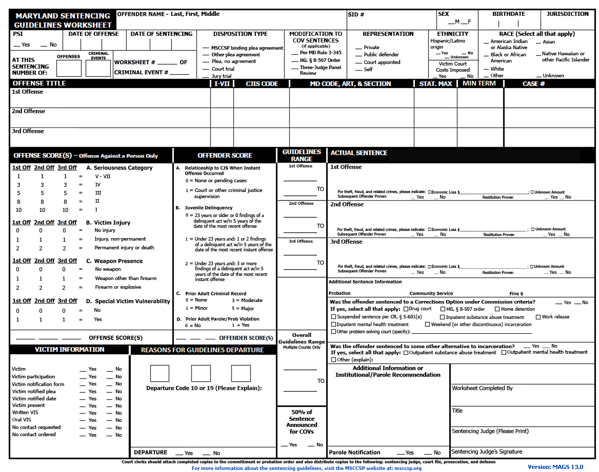 Maryland Sentencing Guidelines Worksheet(Revised, March 9, 2026) Available in PDF Click HERE for an explanation of the changes made to the worksheet in 2026.